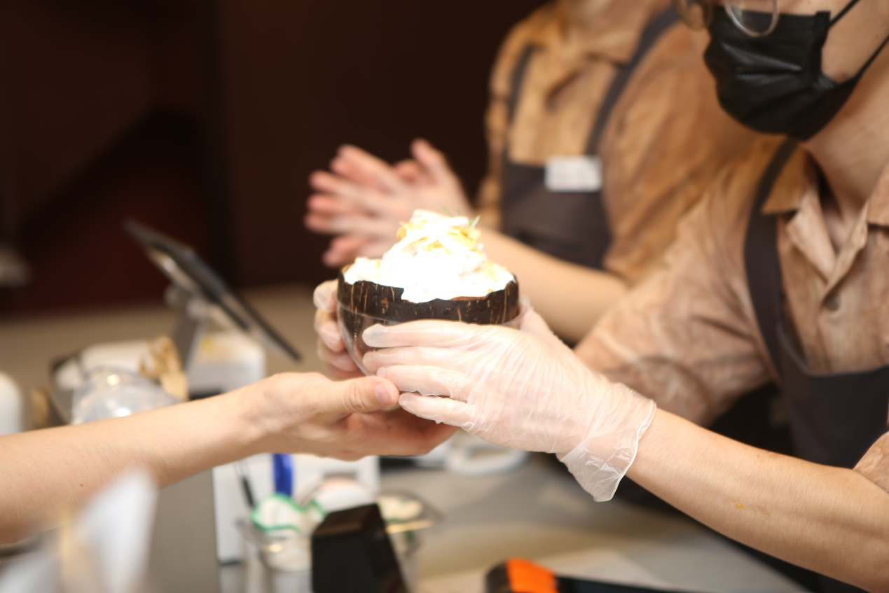 一次性提供如此豐富的手造新品,既是喜茶產品研發能力的集中體現,又是為顧客奉上的極致體驗。記者在現場看到,10點正式營業後,在一樓點單區,店員們開始耐心地向顧客進行新品介紹和推薦。一些顧客則留意到正在進行的現場炒冰,“剛剛做的那份是什麼?我就要那個!”而二層供應的“實在整顆生椰”,也讓不少顧客愛不釋手。