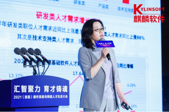 麒麟軟件有限公司高級副總裁、麒麟軟件教育發展中心主任張娜以“麒麟遨天育才鑄魂——致力於打造中國網信產業發展的人才引擎”為主題帶來主旨分享,併發布了麒麟軟件聯合獵聘大數據研究院發佈的《關鍵基礎軟件人才數據報告》。該報告顯示,近三年關鍵基礎軟件領域人才需求急速增長,但市場供給嚴重不足。2021年上半年研發類職位人才需求同比上漲最為明顯,招聘崗位數量同比漲幅超50%,其中研發類人才需求同比上漲96%最為明顯。*注:數據來源:獵聘大數據。正是基於產業人才培養需要,打造網信產業發展的人才引擎,麒麟軟件有限公司設立了麒麟軟件教育發展中心,主要負責麒麟軟件教育品牌建設、人才生態的打造,人才培訓體系與培養體系、認證體系的建設與落地。作為中心負責人,張娜總結了麒麟軟件在教育領域的佈局及階段性成果,分享了麒麟軟件在產教融合領域共創人才培養模式與實踐。