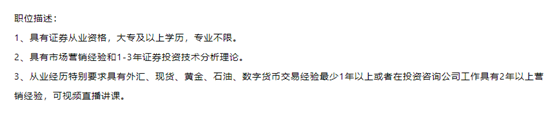 實際上,在招聘流程中,也存在着管理風險。記者查詢招聘信息時發現,證券公司在外部招聘視頻直播、製作人員時,並未着重強調合規和風控。主要體現在,職位描述上缺少對風控、合規經驗的要求,甚至有的職位招聘時,提出需要數字貨幣交易經驗至少一年以上。