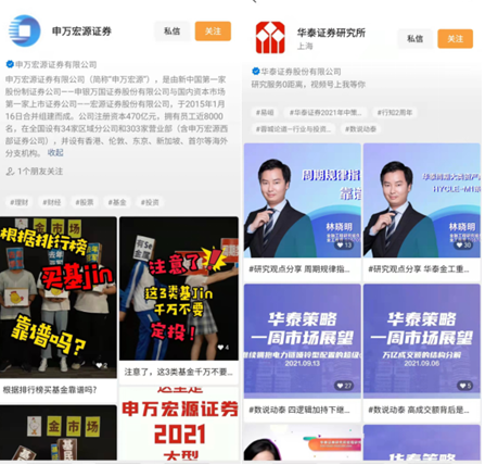 實際上,自2020年以來,證券公司陸續入駐各大視頻平台,比如中金公司、國泰君安、華泰證券、申萬宏源等等四十餘家券商,在微信視頻號、抖音、快手等平台擁有多個藍V賬號。