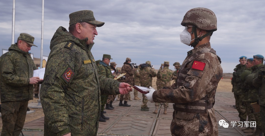 主席台前,在此次演習中表現突出的各國參演部隊官兵代表分別列隊,接受各國指揮員頒發的紀念獎章或獎品。其中,中方參演部隊27名官兵獲此殊榮。中國軍人在此次演習中展現出的戰鬥作風、專業素質和良好形象受到各方高度評價。