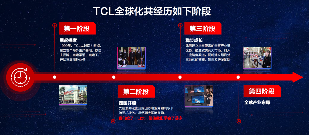 實現上文提到的逆勢增長,與TCL二十餘年的全球化產業佈局密不可分。TCL最早從1999年開始在越南建立首個海外生產基地並輻射到東南亞,邁出國際化的第一步;2004年開始在國際上開展跨國併購,為TCL打開歐美市場、構建全球化佈局打下了堅實基礎;隨後,TCL不斷提升海外經營能力,成功打入歐美市場主流銷售渠道的同時,也建立起海外本地化團隊,一個全面而深入的全球化產業佈局基本形成。