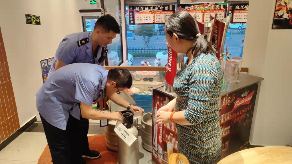 浙江省温州市龍灣區某經營户周某説:“從經銷商處採購扎啤,製作扎啤的機器、二氧化碳氣體都由經銷商免費提供,每次氣罐用完後由經銷商回收。”檢查發現,今年以來,他賣出了660升扎啤,非法獲利2706元。