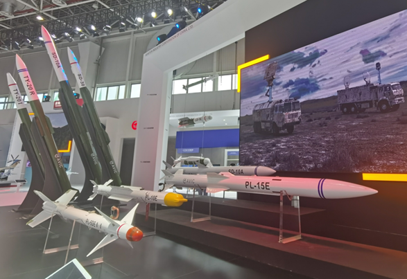 這些空空導彈武器以全比例模型顯示展示。據介紹,PL-15E首次現身中國航展,但該導彈早已經聲名遠揚。現場展示的數據顯示,PL-15E空空導彈長約3.99米,彈徑203毫米,彈重小於210公斤,最大射程達145公里,採用捷聯慣導/衞星組合+主動雷達末制導的組合制導方式,並具有雙向數據鏈修正能力。相對於SD-10A中距空空導彈,最大射程增加超過一倍,是空對空作戰的利器。