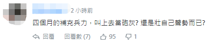 對於台防務部門聲稱,在戰時24小時內可動員21.5萬後備兵力,有不少島內網友質疑,“(訓練)四個月的補充兵力,叫上去當炮灰? 還是壯自己聲勢而已?”↓