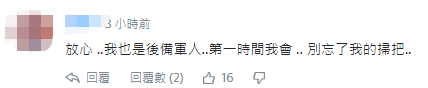 更有自稱是台後備軍人的網友耐人尋味的表示,“放心……我也是後備軍人,第一時間我會……別忘了我的掃把”。↓