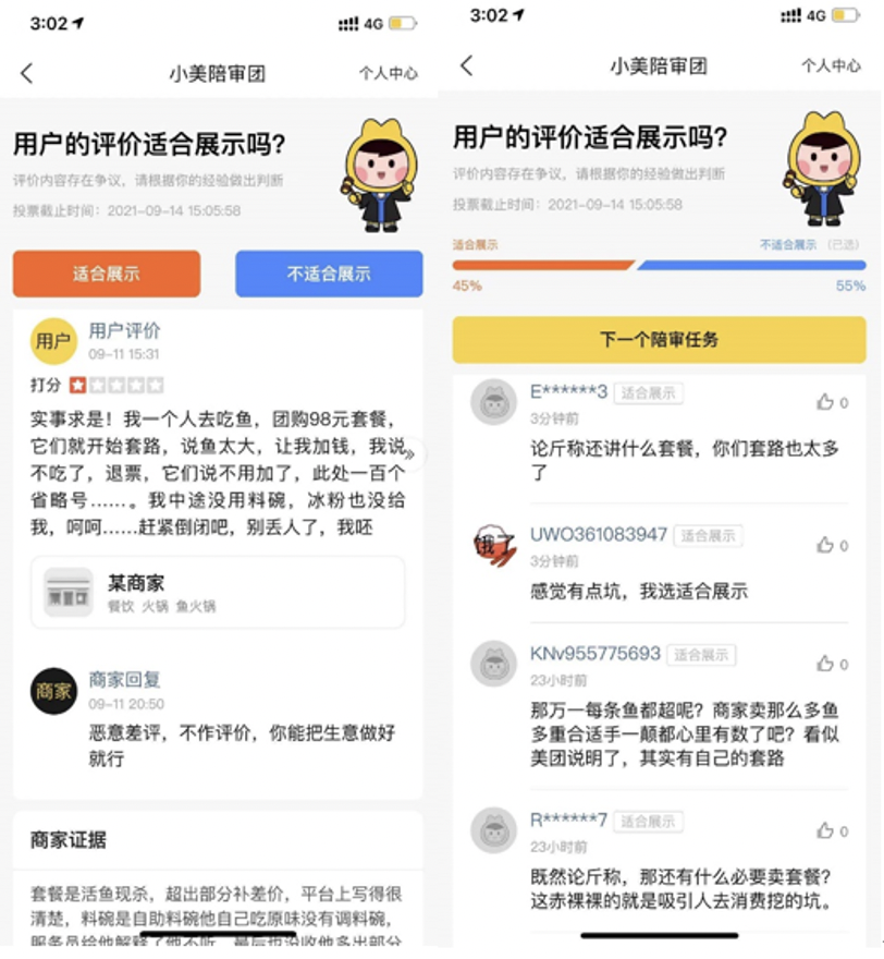 根據美團平台規則,用户和商家遇到評價爭議之後,可以向平台投訴,平台隨機邀請用户加入小美陪審團,對評價爭議集體投票判定,平台將根據投票結果保留或者屏蔽有爭議的評價。此外,用户對消費結果不滿意,或者認為商户服務內容與線上展示不一致等交易爭議,也可以通過公眾評審體系判定。