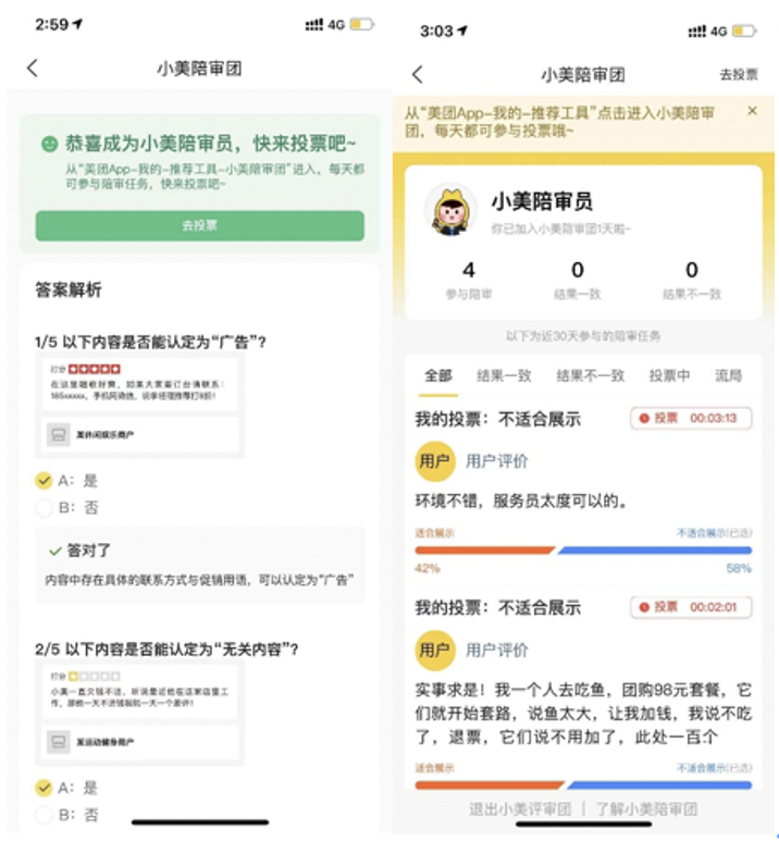 目前,用户在美團App-我的-推薦工具即可直接點擊進入 “小美陪審團”。大眾點評App的大眾評審也可以在大眾點評APP-我的點擊進入,美團外賣App的袋鼠評審,則由系統直接將爭議糾紛推送給符合條件的用户。