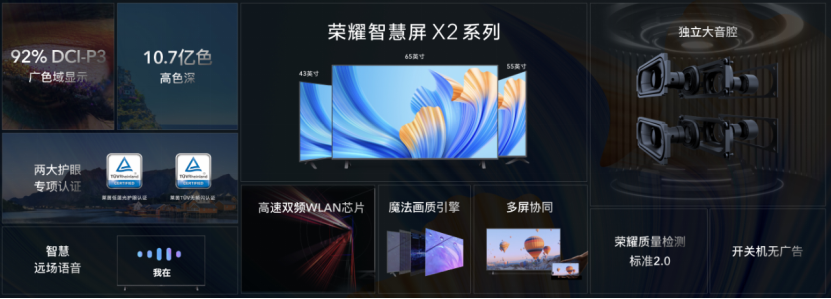 榮耀智慧屏X2是繼智慧屏明星產品X1後又一款高品質智能大屏。音畫表現上,全尺寸榮耀智慧屏X2配備10.7億色廣色域全綵屏和獨立大音腔揚聲器,畫面色彩層次鮮明、音質表現臨場感十足。