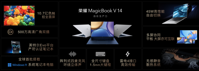 據發佈會上介紹,作為榮耀首款旗艦級筆記本,榮耀MagicBook V 14以八大旗艦產品力:極致輕薄美學設計、最佳音視頻會議系統、10.7億色觸控全面屏、45W高性能釋放+無感靜音散熱、多屏協同再升級、全尺寸舒適鍵盤、大電池長續航+便攜快充,英特爾Evo認證+全球首批預裝Windows11系統,樹立高端筆記本新標杆,助力榮耀加速衝擊高端市場。
