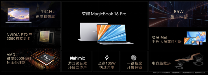 本次發佈會上,榮耀MagicBook 16/16 Pro鋭龍版也正式亮相。該產品以144Hz電競理想屏、85W滿血性能、智慧體驗為核心,同時延續了輕薄金屬機身、窄邊框等優勢設計,兼具強悍性能與輕薄設計。