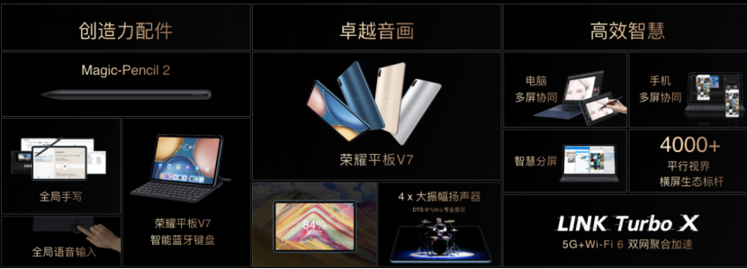 榮耀平板V7軟硬兼顧,實現了業內首屈一指的生態體驗和影音表現。榮耀平板V7 Pro發佈後,憑藉其強大的性能、高效的智慧化體驗、成熟的生態及強大的配件,被外界普遍認為是安卓平板陣營的代表之作,與華為MatePad、蘋果iPad“三足鼎立”。此次隨着榮耀平板V7的加入,榮耀平板V7系列將為消費者提供更為多元的選擇和體驗。