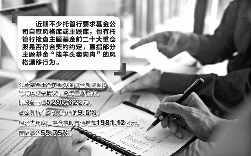 據證券時報記者瞭解,繼前期監管部門針對基金風格偏離做“窗口指導”後,近期,不少託管行要求基金公司自查“風格庫”或“主題庫”,也有託管行檢查主題基金前二十大重倉股是否符合契約約定,直指部分主題基金“掛羊頭賣狗肉”的風格漂移行為。