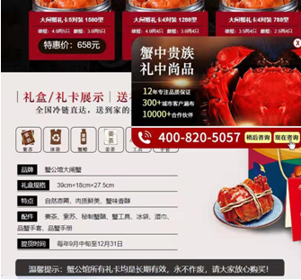 “蟹公館”大閘蟹的首頁宣傳語中寫着,禮盒、禮卡展示、送禮佳品,全國冷鏈直達,送到家的美味,提貨時間為每年9月中旬至12月31日。另外,重點附有一條“長期有效,永不作廢。”