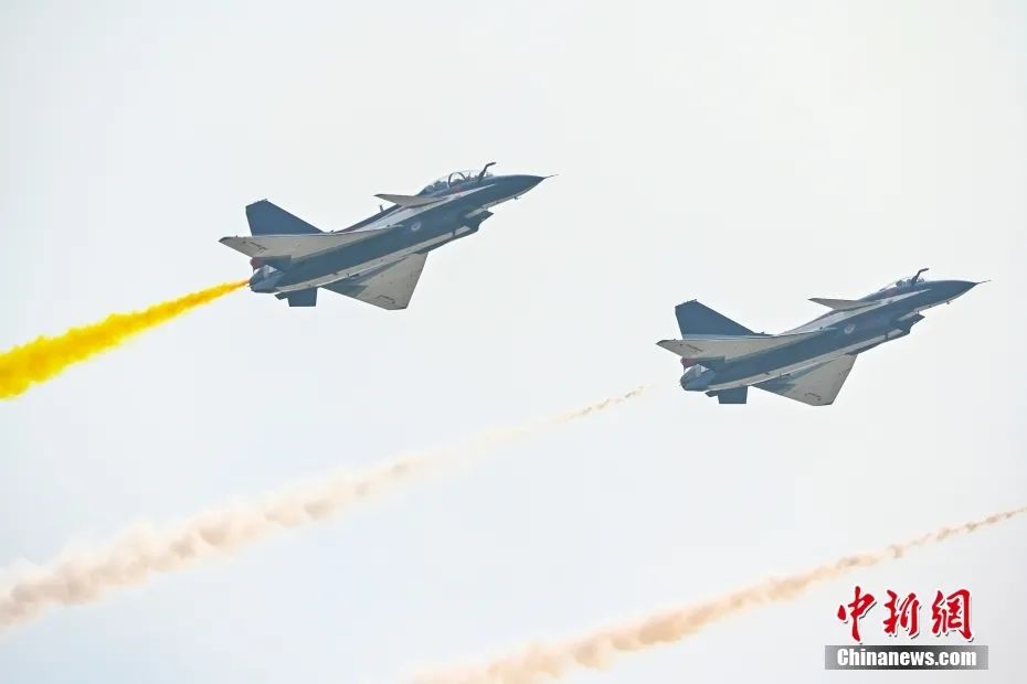 9月28日,廣東省珠海市,教—10飛機在珠海國際航展中心上空飛過。當日,第十三屆中國航展在珠海國際航展中心開幕。中新社記者 陳驥旻 攝