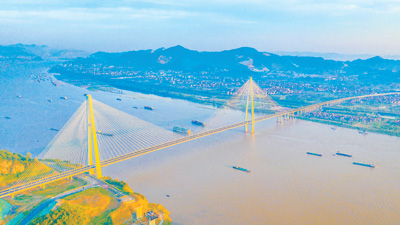9月25日,湖北武穴長江公路大橋正式通車。圖為朝霞映照下的武穴長江公路大橋。
