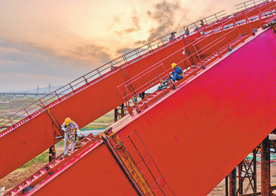 8月20日,安徽省合肥市廬江縣,引江濟淮G3高速特大橋拱肋順利合龍。圖為8月21日,建設者在施工作業。