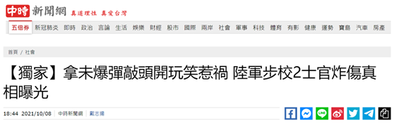 【環球網報道 記者 康博浩】據台灣“中時新聞網”消息,台軍高雄“陸軍步兵訓練指揮部(簡稱:步訓部)”昨(7日)進行槍榴彈射擊訓練時發生未爆彈爆炸的意外事故,造成2名受訓士官頭部、手部被炸傷。“步訓部”事後調查發現,事故原因疑似為士官拾獲未爆彈,2人未遵守安全規定,其中一人疑似拿未爆槍榴彈開玩笑敲對方的頭,結果引爆火藥才導致意外。