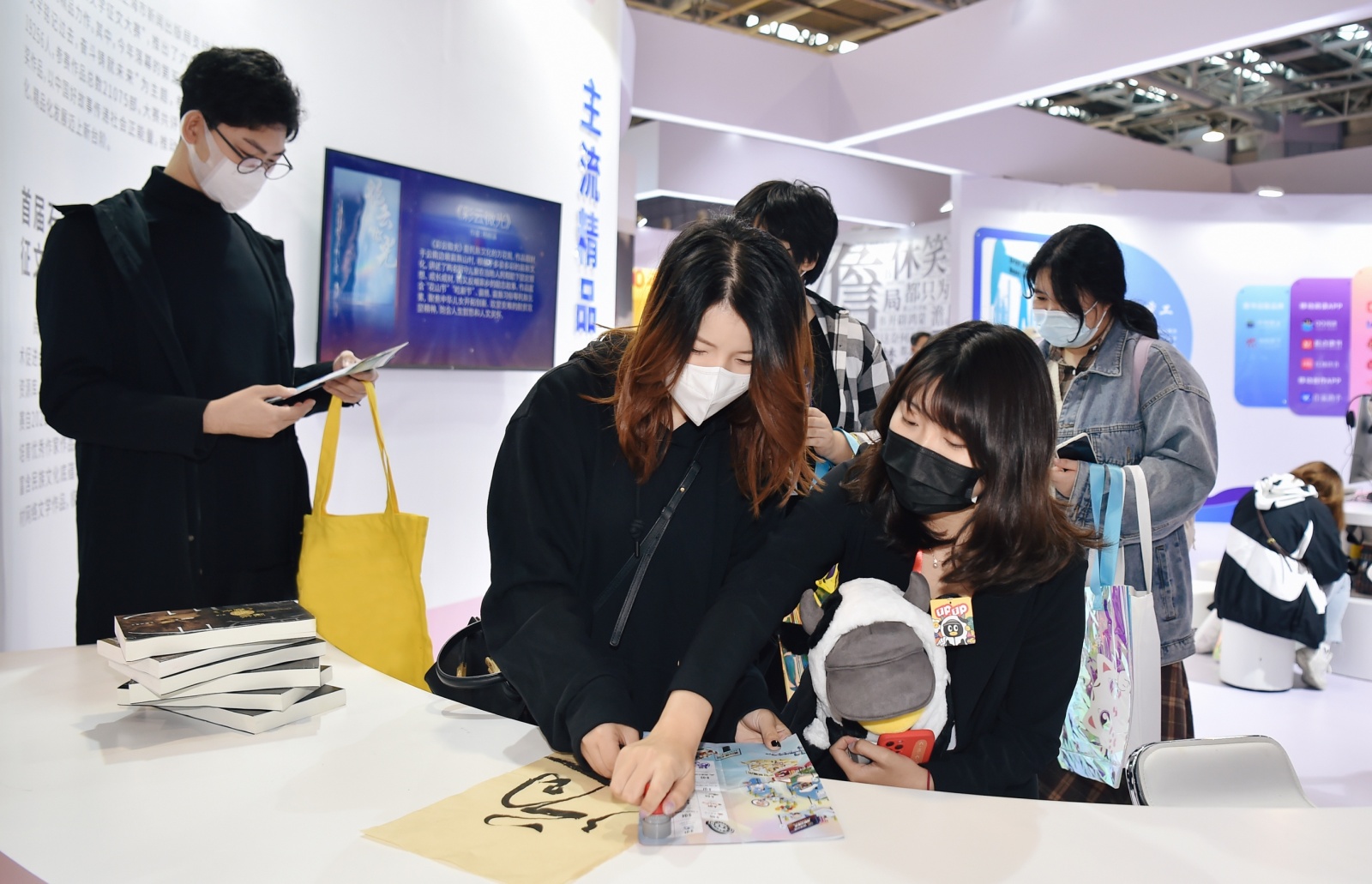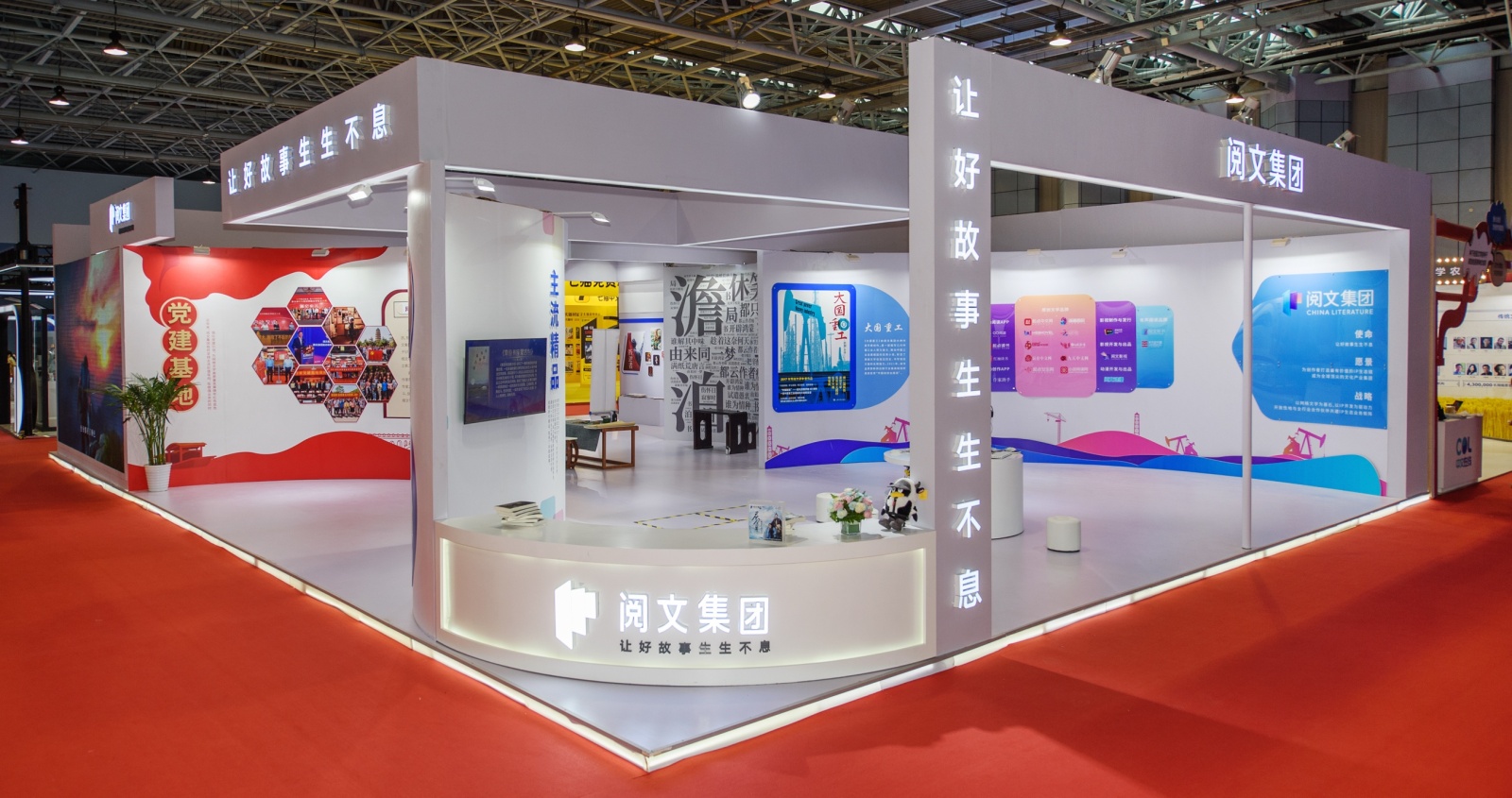 今年的大會上,閲文展台以 “讓好故事生生不息”的企業使命為核心設計理念,設置了“黨建引領”、“主流精品”、“澹泊書局”、“影視天地”、“漫遊世界”等板塊,並融合非遺展示、影片展映、互動體驗等多種形式,立體化呈現閲文集團的多元業務矩陣,讓好故事以聲漫影遊等形式解鎖觀眾的想象空間。