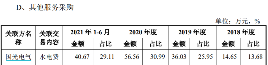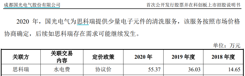 此外,思科瑞和國光電氣互為關聯方,根據思科瑞發佈的招股書披露數據,該公司在2018年到2020年向國光電氣採購水電費金額分別為14.65萬元、36.03萬元和56.56萬元;而根據國光電氣此前發佈的招股書披露,同期向思科瑞結算水電費金額中,2018年和2019年與思科瑞披露完全一致,但是2020年結算金額為55.37萬元,與思科瑞披露的金額存在差異。