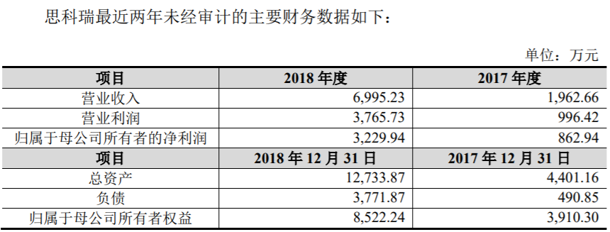 另據杭錦科技此前發佈的公開信息,思科瑞2018年實現營業收入6,995.23萬元、歸母淨利潤為3,229.94萬元,但是根據思科瑞本次遞交的招股書顯示,2018年營業收入為6575.73萬元、歸母淨利潤為2224.92萬元,大幅低於此前杭錦科技披露的金額。