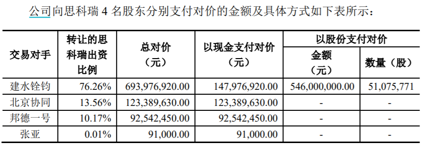 首先值得關注的是,2019年6月,上市公司杭錦科技發佈了購買資產預案,計劃以11.5億元的整體估值收購的國光電氣98%的股權、以9.1億元的整體估值收購思科瑞100%的股權。根據杭錦科技當時的信息披露,該公司向思科瑞4名股東支付對價,包括建水銓鈞、北京協同、邦德一號和張亞。