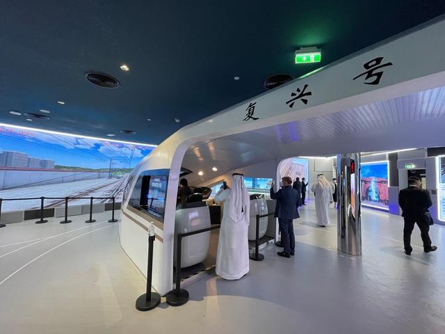 在“中國高鐵”展項,觀眾可以進入等比例的駕駛艙,模擬駕駛“復興號”高鐵,體驗從北京出發,途經上海、阿布扎比抵達迪拜世博園區的虛擬路線。
