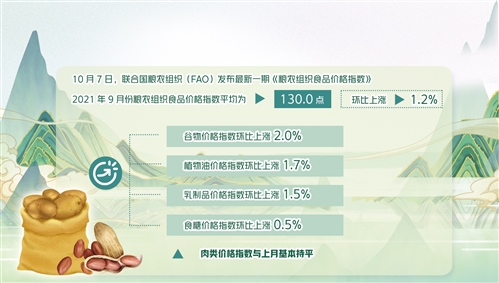 本報日內瓦訊(記者楊海泉)10月7日,聯合國糧農組織(FAO)發佈最新一期《糧農組織食品價格指數》指出,2021年9月份糧農組織食品價格指數平均為130.0點,環比和同比分別上漲1.2%和32.8%。該指數最新一輪上漲的主要原因是多數穀物和植物油價格攀升,乳製品和食糖價格同樣走高。