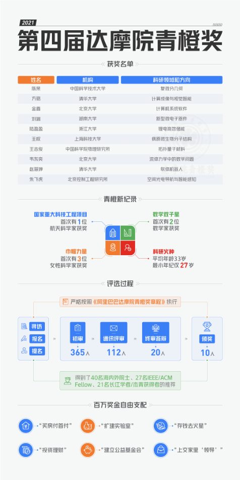 10月14日,2021達摩院青橙獎公佈獲獎名單,朱飛虎、韋東奕、陸盈盈等十名青年學者獲獎,分享千萬獎金。青橙獎見證了中國青年科研人才的迅猛發展,今年首度頒給國家重大科技任務的貢獻者,為科研大時代中“最好的他們”畫下注腳。