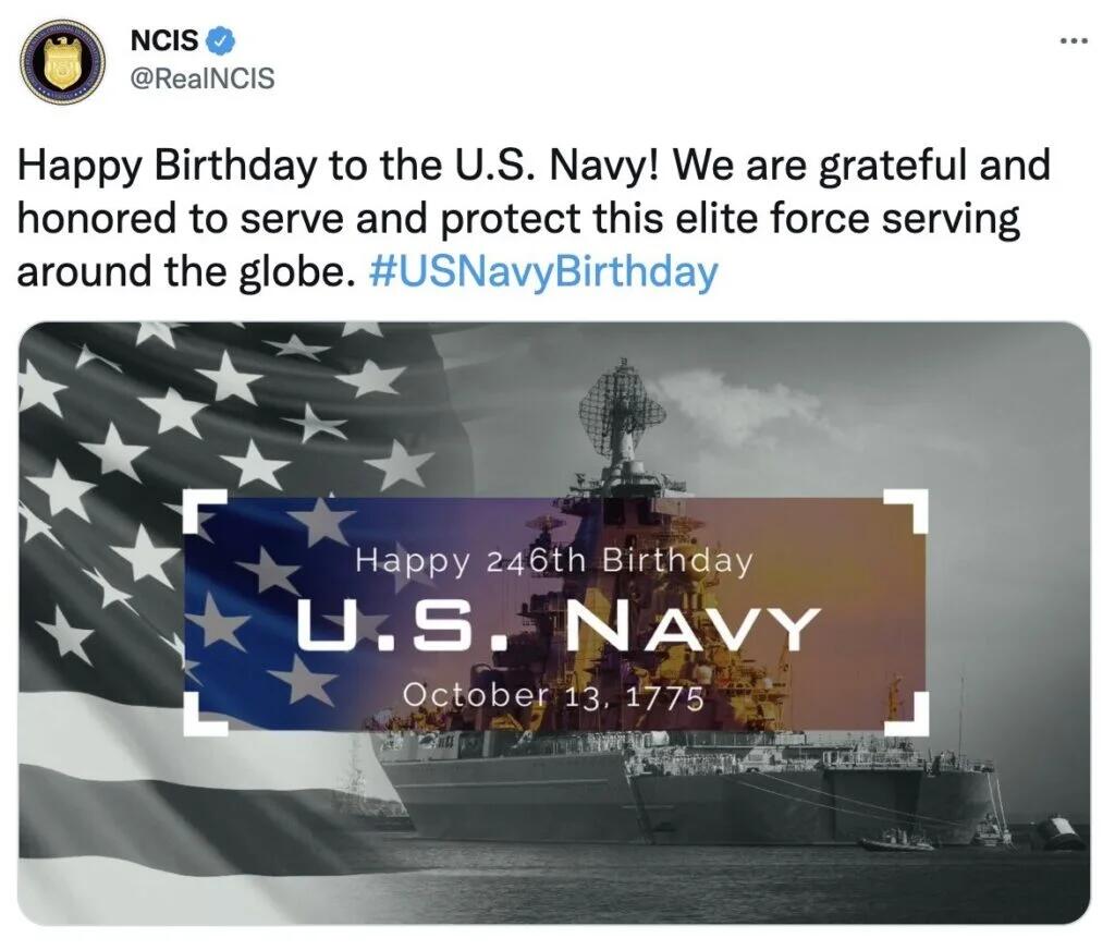 報道稱,美國海軍犯罪調查局(NCIS)在其官方推特賬户上發佈了一張合成圖片,慶祝美國海軍246歲生日,然而圖片中的畫面卻是美國國旗配上了俄羅斯海軍的基洛夫級巡洋艦。