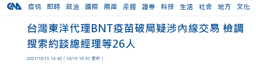 【環球網報道 記者 康博浩】據台灣“中央社”消息,台灣東洋藥品工業股份有限公司(簡稱:台灣東洋)爭取代理德國BNT新冠肺炎疫苗破局(失敗),並被質疑牽涉內線交易。台灣士林地檢署今天(15日)指揮“調查局”搜查台灣東洋公司等26個處所,約談台灣東洋公司總經理施俊良等26人到案釐清案情。