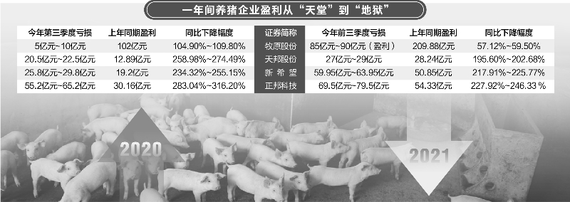 第三季度,牧原股份預虧5億元至10億元,天邦股份預虧20.5億元至22.5億元,新希望預虧25.8億元至29.8億元,正邦科技預虧55.2億元至65.2億元……
