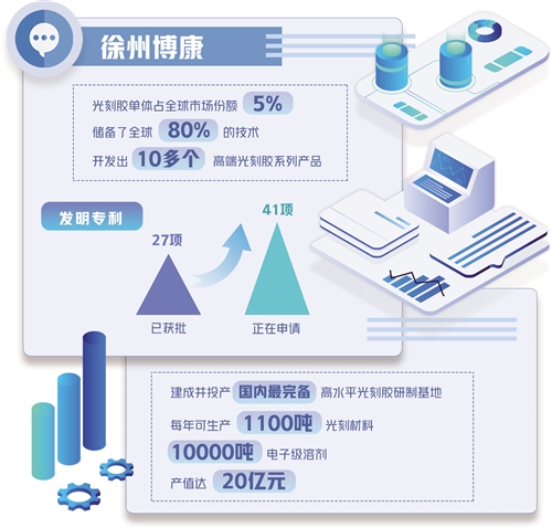 工欲善其事,必先利其器。今年6月份,徐州博康建成並投產國內最完備的高水平光刻膠研製基地,每年可生產1100噸光刻材料、10000噸電子級溶劑,產值達20億元。“徐州博康不僅在光刻膠單體生產上實現了突圍,也在光刻膠產業鏈研發製造及光刻機的研發上全面發力。”邵嚴亮介紹説,目前徐州博康光刻膠單體佔全球市場份額5%,儲備了全球80%的技術,開發出10多個高端光刻膠系列產品。