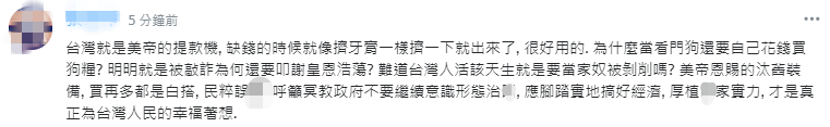 還有批評稱,“台灣就是美帝的提款機”,缺錢的時候就像擠牙膏一樣擠一下就出來了,很好用的。為什麼當看門狗還要自己花錢買狗糧?明明就是被敲詐為何還要叩謝皇恩浩蕩?難道台灣人活該天生就是要當家奴被剝削嗎?美國恩賜的汰舊裝備,買再多都是白搭……呼籲民進黨當局不要繼續意識形態治台,應腳踏實地搞好經濟,厚植台灣實力, 才是真正為台灣人民的幸福着想。