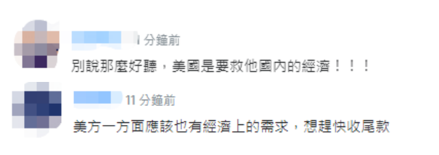 “別説那麼好聽,美國是要救他國內的經濟!”有網友諷刺,“美方一方面應該也有經濟上的需求,想趕快收尾款。”