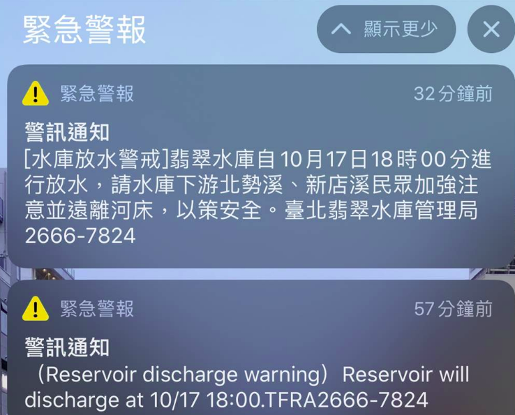 報道稱,過了25分鐘後有民眾才收到中文版警報通知,稱翡翠水庫自10月17日18時起進行放水,水庫下游地段北勢溪、新店溪附近民眾加強注意並遠離河牀,以策安全。不過也有人反映只收到英文版,還有2個版本都沒收到的狀況。