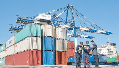 今年,山東自貿試驗區煙台片區推行“兩步申報”、“先出區後報關”等投資貿易便利化改革,壓縮船舶進出港時限,大力優化營商環境。圖為10月12日,在山東港口煙台港國際集裝箱碼頭,海關關員對外貿集裝箱進行現場監管。