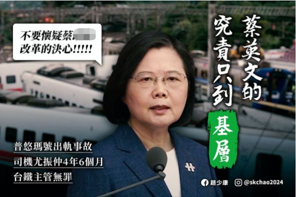 趙少康今天在臉書發文表示,蔡英文的追究到底“只到基層”,2018年台鐵“普悠瑪號”列車翻覆,造成18人遇難,蔡英文曾當面承諾遇難者家屬“這件事情我們一定會究責到底,現在正加速改善整個系統”。不過,一審宣判後,無人負起政治責任,“普悠瑪號”事故自救會會長重批“這個判決顯見台鐵依舊沒改善!”