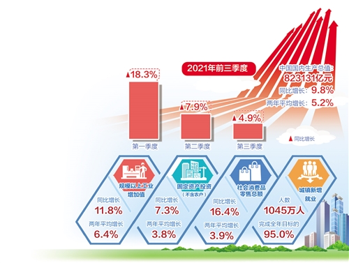 國家統計局10月18日發佈數據顯示,前三季度,國民經濟總體保持恢復態勢。初步核算,前三季度國內生產總值823131億元,按可比價格計算,同比增長9.8%,兩年平均增長5.2%。
