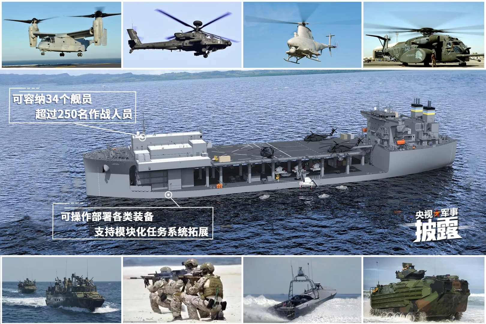 下層是任務甲板 ,模塊化集裝箱任務艙,存儲大量物資、掃雷艇、快艇、特種部隊和武器彈藥等,能夠支持各種前沿作戰、水雷戰、小型登陸戰,並提供後勤保障服務。