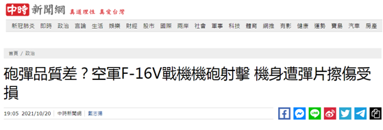【環球網報道】據台灣“中時新聞網”消息,台空軍日前開始在花蓮基地進行年度“天龍”演習,今天(20日)卻傳出意外事件,台空軍1架F-16V戰機在進行航炮射擊打靶時,疑似被自身射出的炮彈損傷。在返航後進行安檢,台空軍專家排除是被炮彈直接擊傷的可能性,初步分析可能是台灣自產的炮彈質量不良,其破片擦傷機身,目前正進行調查。