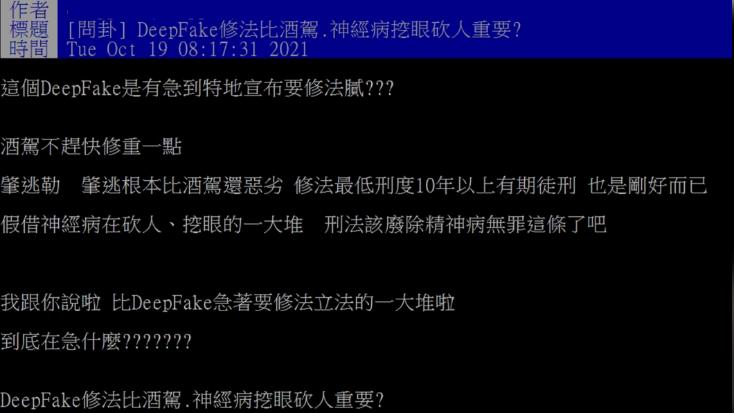 “TVBS新聞網”提到,針對蔡英文大動作要求修法,有島內網友在網上發文稱,“DeepFake(AI換臉)是有急到特地宣佈要修法?酒駕不趕快修重一點,肇逃(肇事逃逸呢)?根本比酒駕還惡劣,還有砍人、挖眼的一大堆,這個到底在急什麼?”↓
