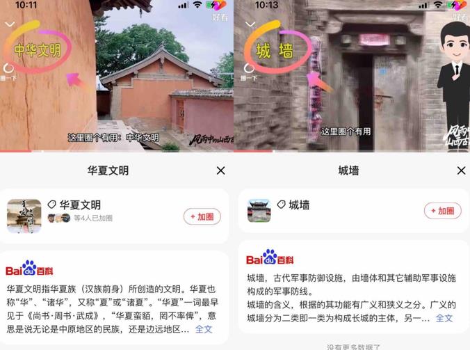 據介紹,“風雨中的古建”系列節目,從山西古建築的歷史、保護、結構、修繕等多個角度為廣大網友介紹了山西古建築的現狀。記者體驗發現,該系列視頻出現特定場景時,畫面中會有像“古城佈局”、“古城修葺”、“城牆”、“中華文明”這樣的名詞被圈出。點擊這些被圈出的名詞,視頻下方就會彈出相關詞條鏈接,點進去就會看到來自百度百科、百家號文章等權威的解析。