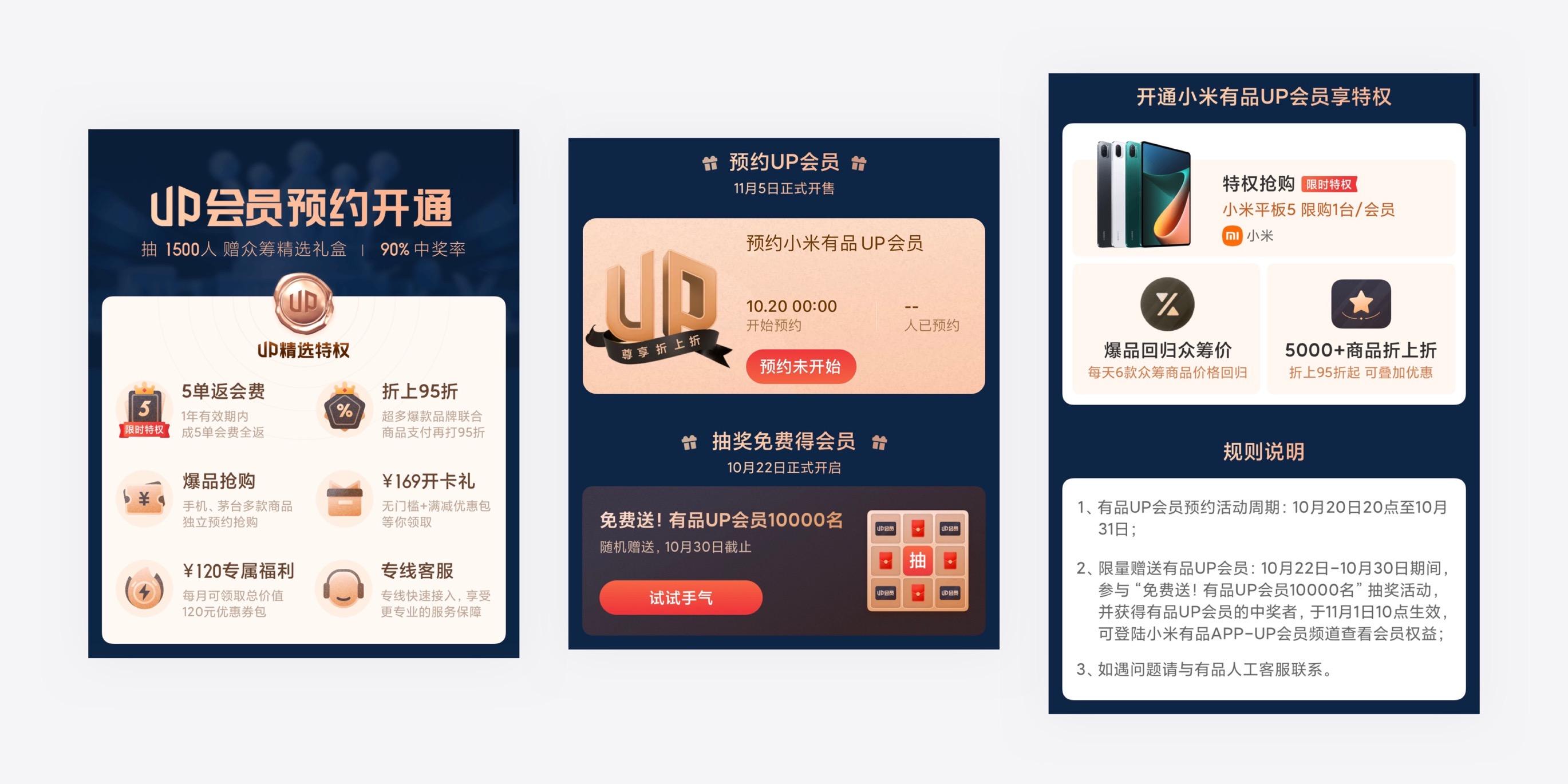20日當天,小米有品上線了全新會員體系——UP會員的預約活動。頁面規則顯示,小米有品UP會員尊享6大權益,包括滿5單返會費、折上再享95折、爆品優先搶購、169元開卡禮、120元月度福利及專線客服。