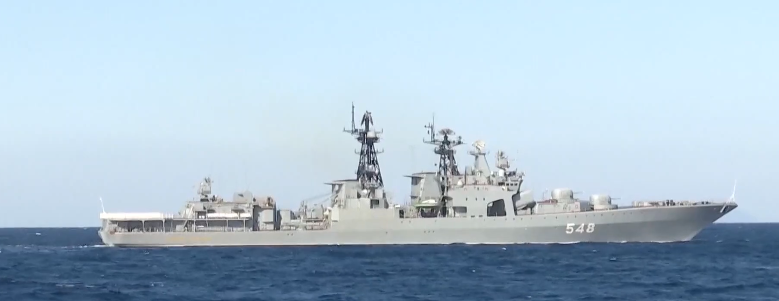 俄方艦艇分別為1155型大型反潛艦“潘捷列耶夫海軍上將”號、“特里布茨海軍上將”號、“克雷洛夫元帥”號電子偵察船、22350型護衞艦“響亮”號以及“俄聯邦英雄阿爾達爾·齊登扎波夫”號。