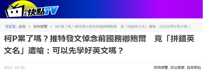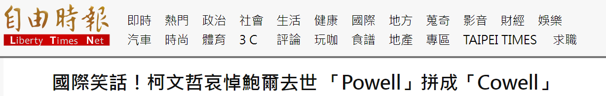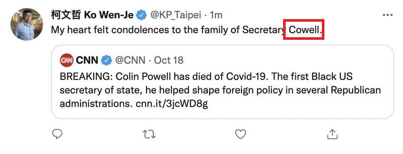 【環球網報道 記者趙友平】美國前國務卿鮑威爾(Colin Powell)18日因新冠併發症去世。“中天電視”、《自由時報》等台媒消息,台北市長柯文哲20日在推特發文哀悼,卻被網友抓包把鮑威爾名字拼錯,“Powell”拼成“Cowell”,成“國際笑話”。