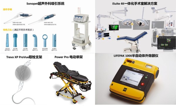 Sonopet超聲外科吸引系統(左上)、iSuite 4K一體化手術室解決方案(右上)、Trevo XP ProVue取栓支架(左下)、Power Pro 電動單架(中下)、LIFEPAK 1000半自動體外除顫儀(右下)