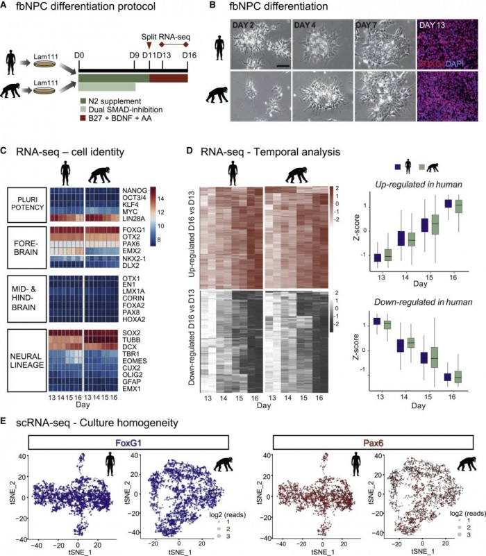 我們沒有研究活生生的人類和黑猩猩,而是使用了在實驗室中生長的幹細胞。這些幹細胞是由我們在德國、美國和日本的合作伙伴從皮膚細胞中重新編程的。然後我們檢查了我們已經發展成腦細胞的幹細胞。