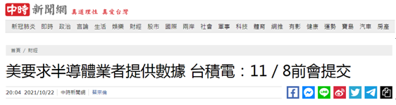 據此前報道,美國商務部日前舉行半導體高峯會,包括台積電、三星、英特爾等半導體大廠都與會。“中時新聞網”引述韓媒消息稱,此次美國態度強硬,以提高芯片“供應鏈透明度”為由,要求台積電、三星等晶圓代工廠交出被視為商業機密的庫存量、訂單、銷售紀錄等數據,這可能會削弱大廠的議價能力與競爭力。