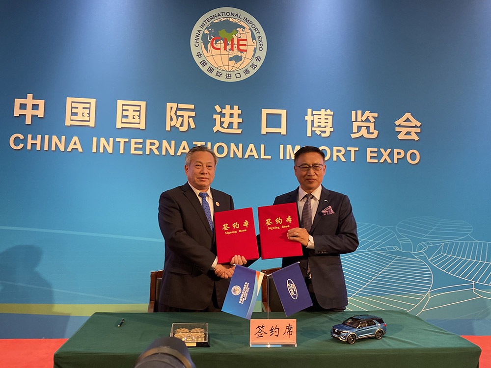 進博局副局長、國家會展中心黨委書記劉福學與福特汽車公司集團副總裁、福特汽車(中國)有限公司總裁兼首席執行官陳安寧簽署合作協議,由福特汽車提供旗下福特和林肯兩個品牌50輛接待用車,服務第四屆進博會。